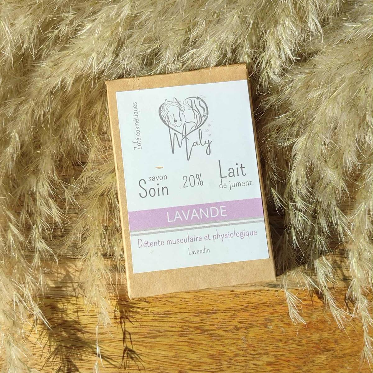 Composition : huile d'olive, beurre de coco, beurre de cacao, lait de jument, huile de ricin, soude caustique, huile essentielle de lavande